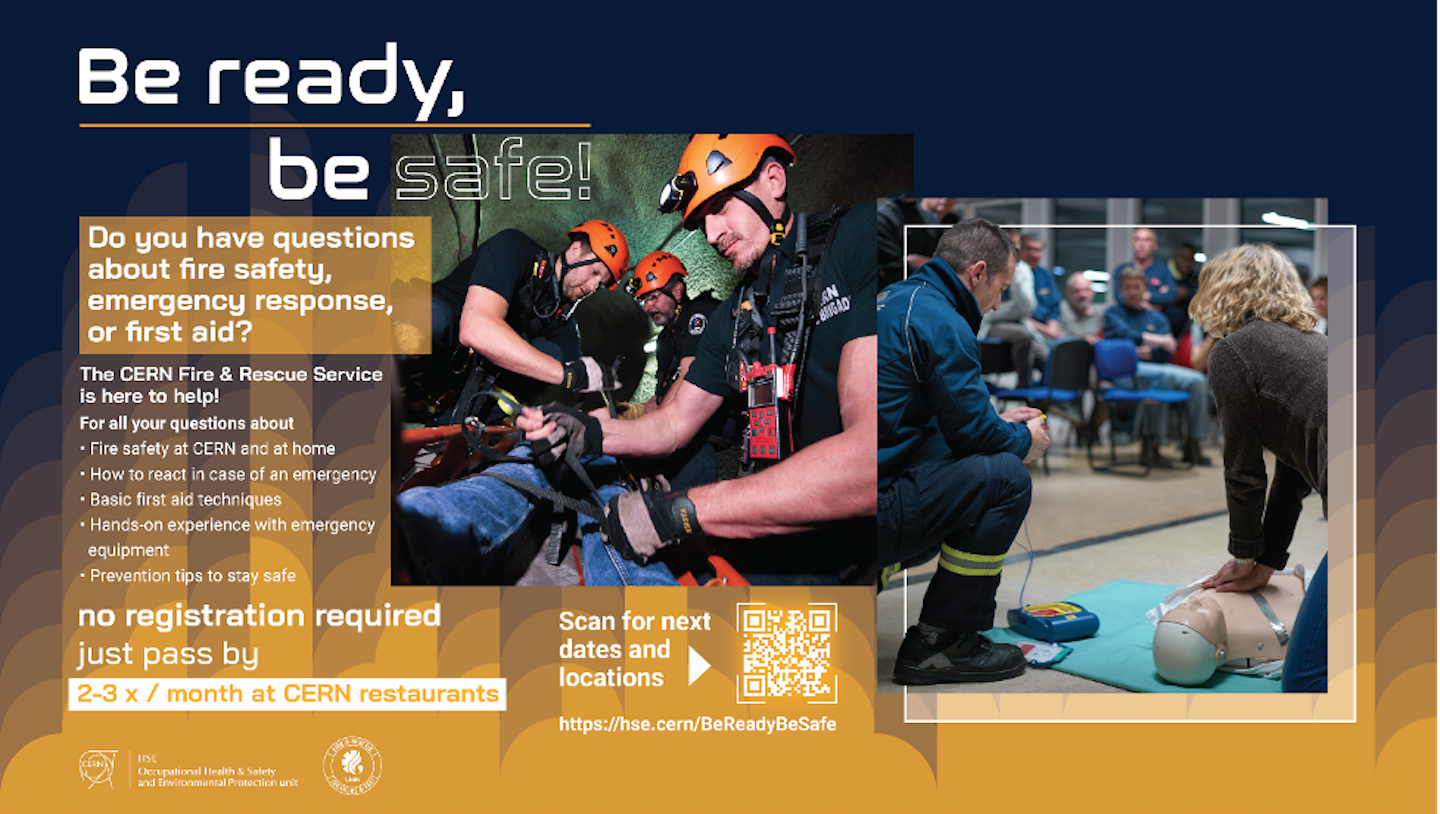 Deux ou trois sessions seront organisées tous les mois, en alternance dans les trois restaurants du CERN. Pour connaître le programme complet, consultez le site : https://hse.cern/BeReadyBeSafe. Passez nous voir !