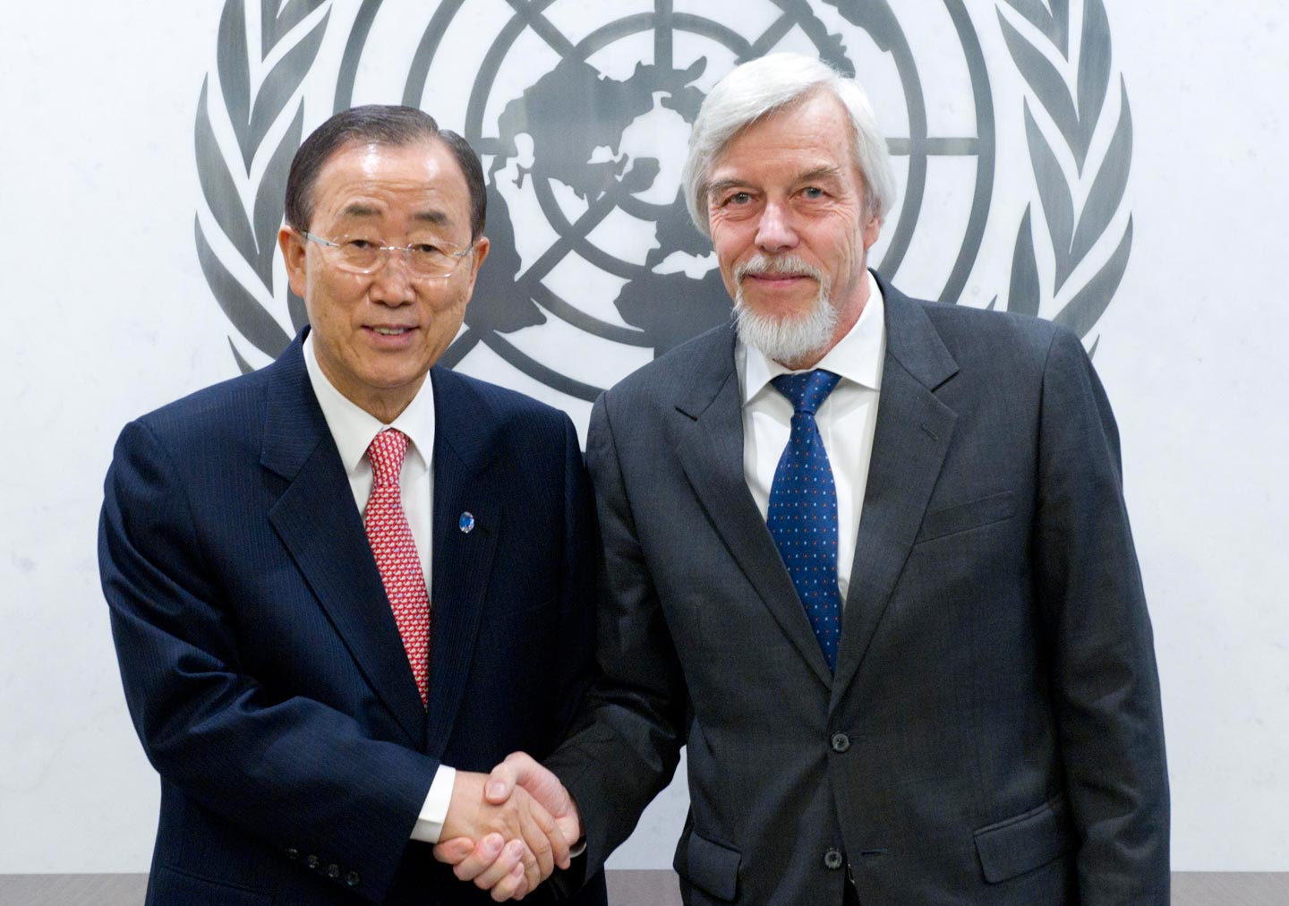 On 17 December CERN's Director-General, Rolf Heuer, met with Ban Ki-moon, Secretary-General of the United Nations (UN). Their meeting follows CERN's accession to status of observer at the United Nations General Assembly on 14 December. The two leaders discussed CERN's new status and how the laboratory can contribute to the Assembly's work. Rolf Heuer pledged that CERN was willing to actively contribute to the UN's efforts to promote science. In particular, CERN can help with the 'Science for sustainable development' initiative coordinated by UNESCO, and with objectives of the post-2015 agenda.