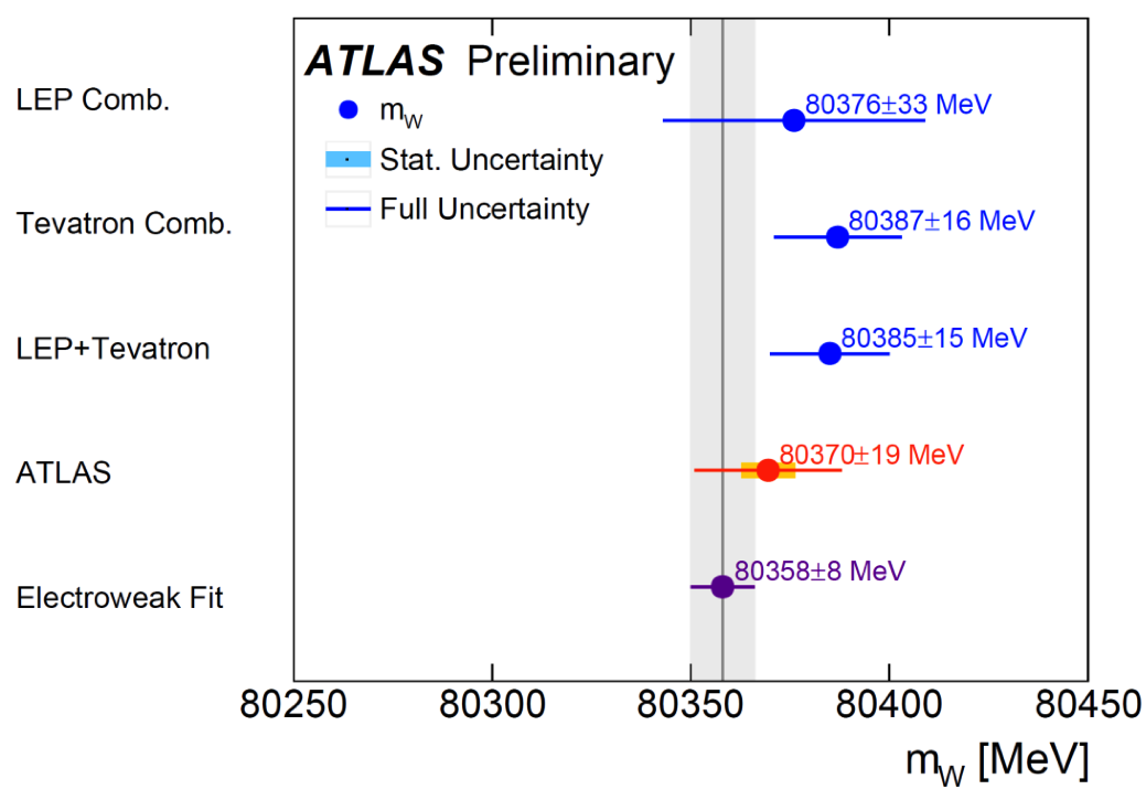 The latest results from ATLAS show a measured value of 80370±19 MeV, which is consistent with the Standard Model prediction. It is also consistent with the combined values measured at the LEP and Tevatron colliders, and with the world average (see graph above).